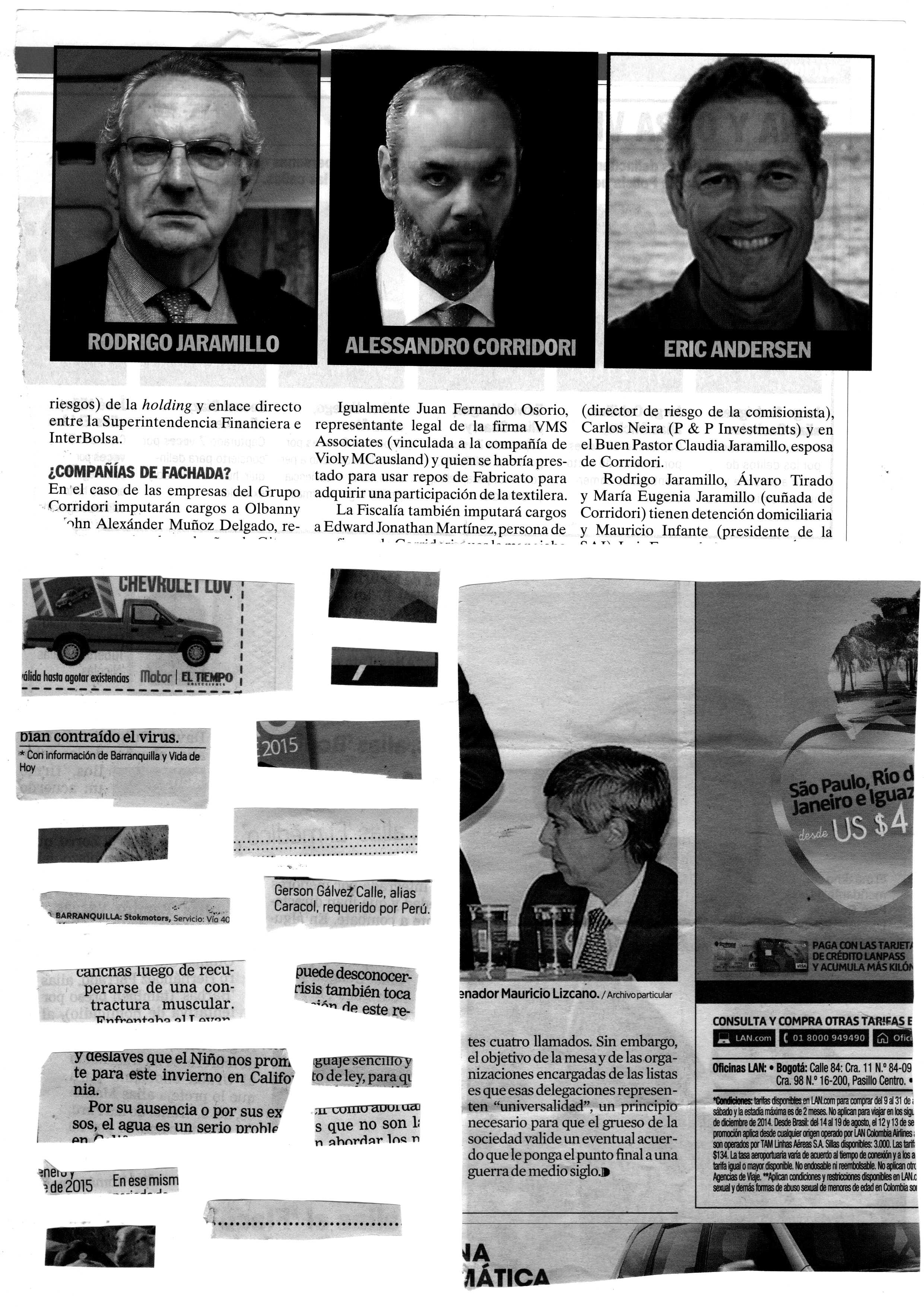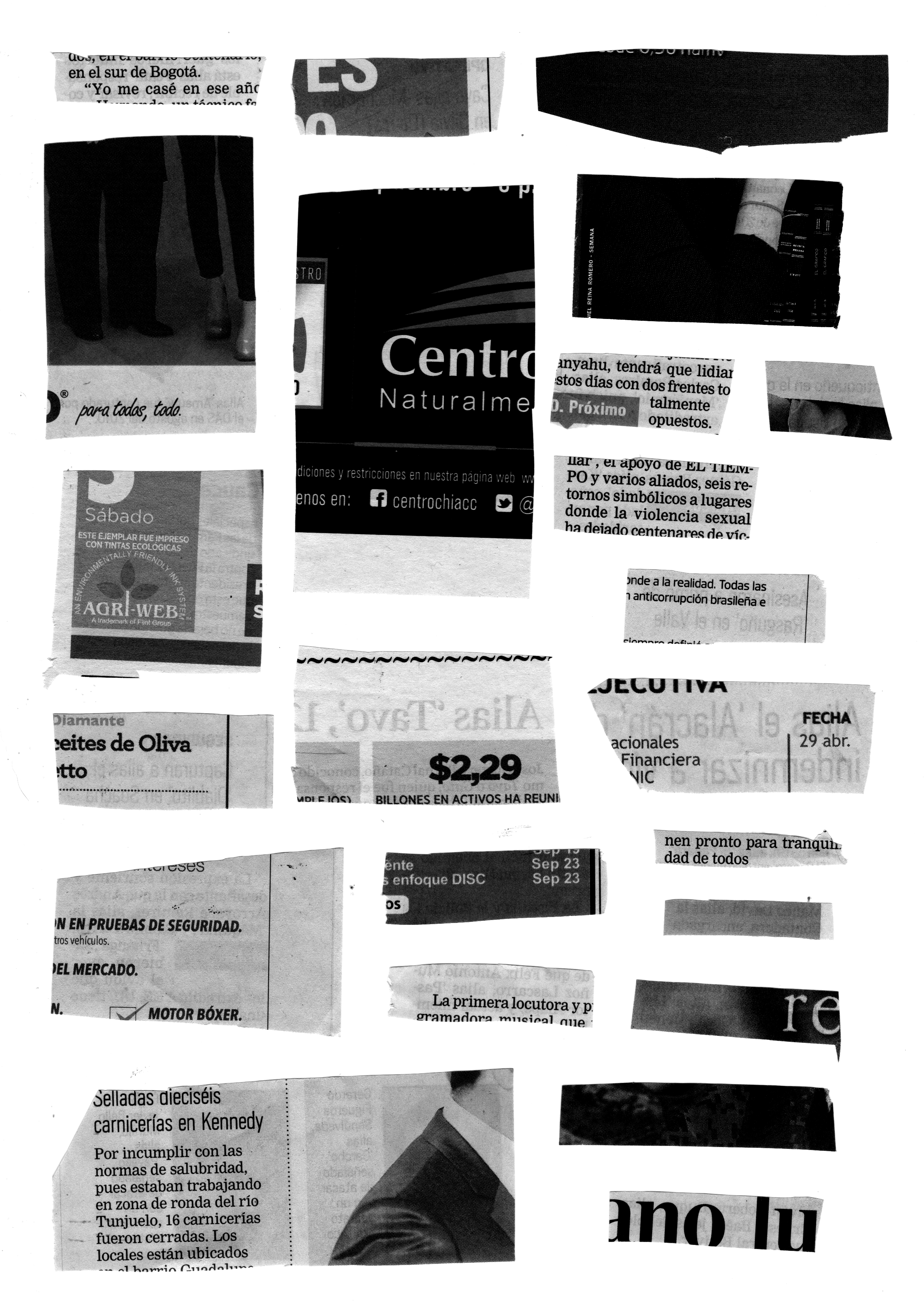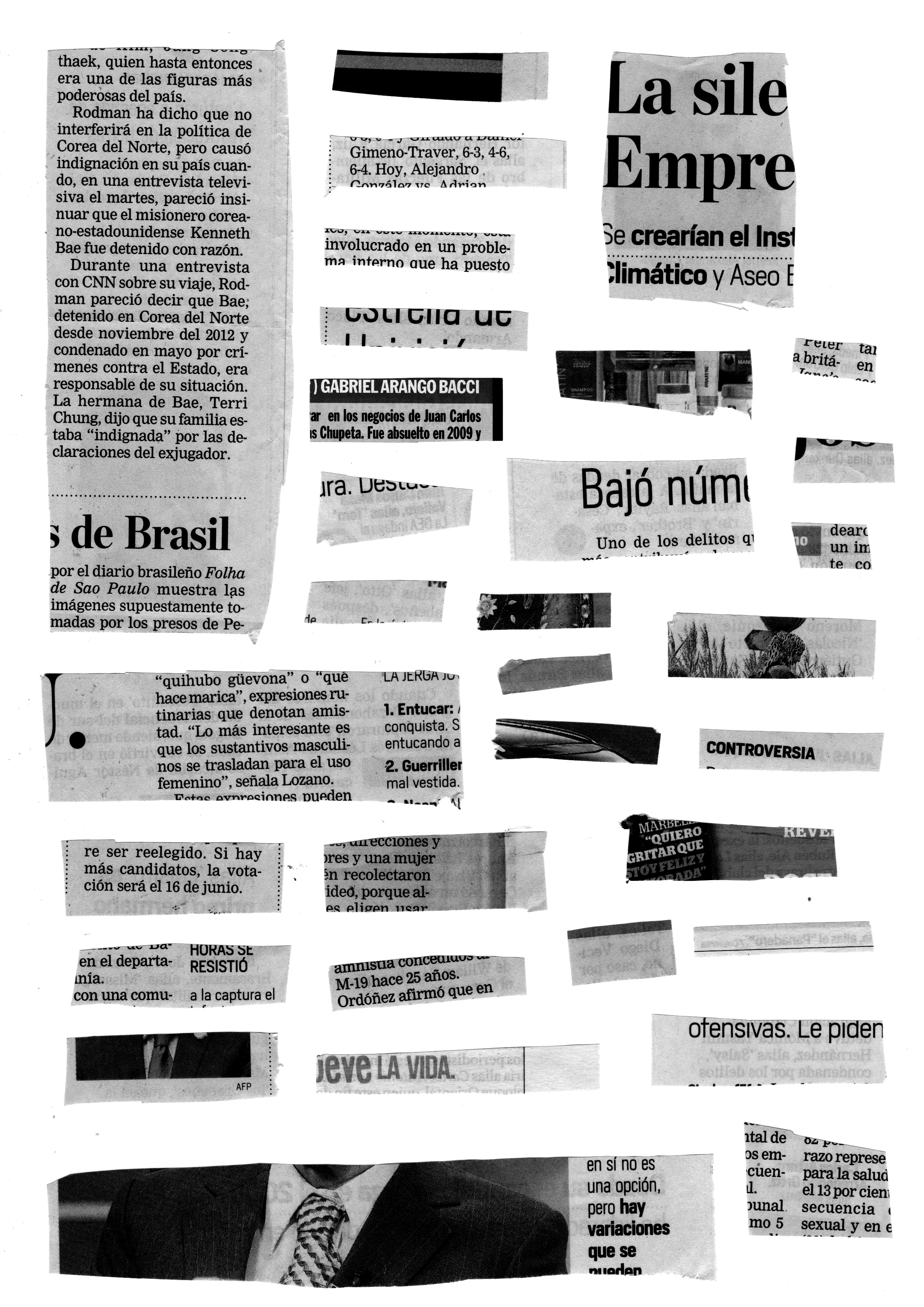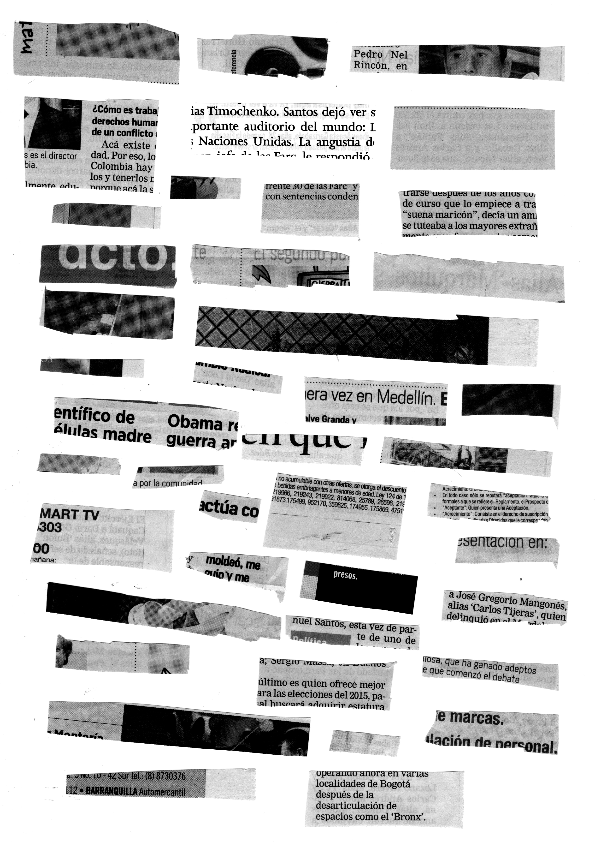 Around 800 Colombian newspaper cutouts, shape a five years compilation of “aliases” of the national conflict in Colombia and its criminal organizations. This collection became an editorial work that could be called a piece of hipper-realist design. Both faces of the small pieces of paper are reproduced in their original sizes. One “alias” per sheet, one face per page, 800 pages.