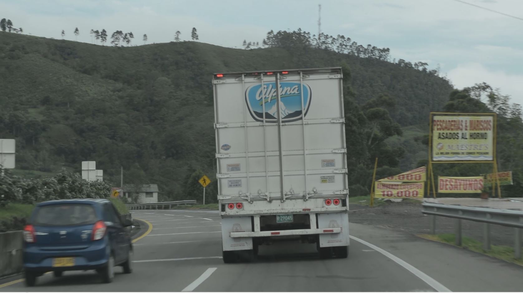 "(...)first there are the overpowering Andes, conceptually shaped by the nineteenth-century European gaze, and in contrast there is the alpine mountain, white and with a blue background. Here a series of historical links are intertwined that allow us to question the alpine image within the famous logo, and at the same time the role of that image that runs through space, since throughout the video the viewer can only see the back of the vehicle. Therefore, in this case it is not so much the truck that makes the trip, but the logo that moves from the angle proposed by the camera."
